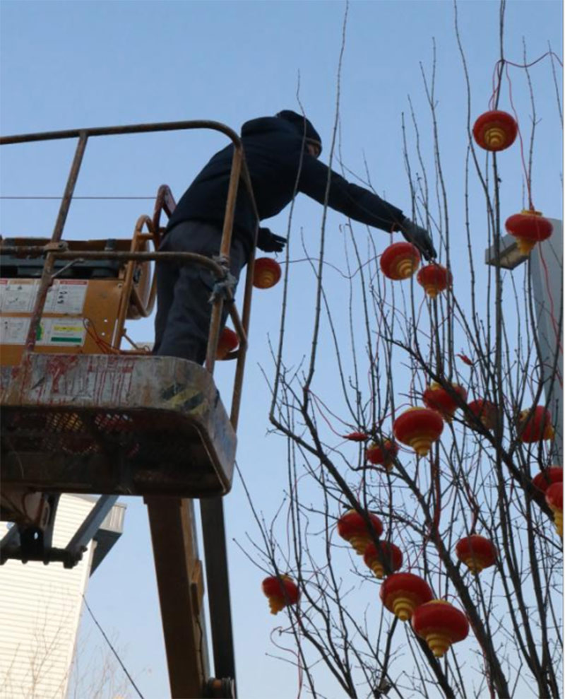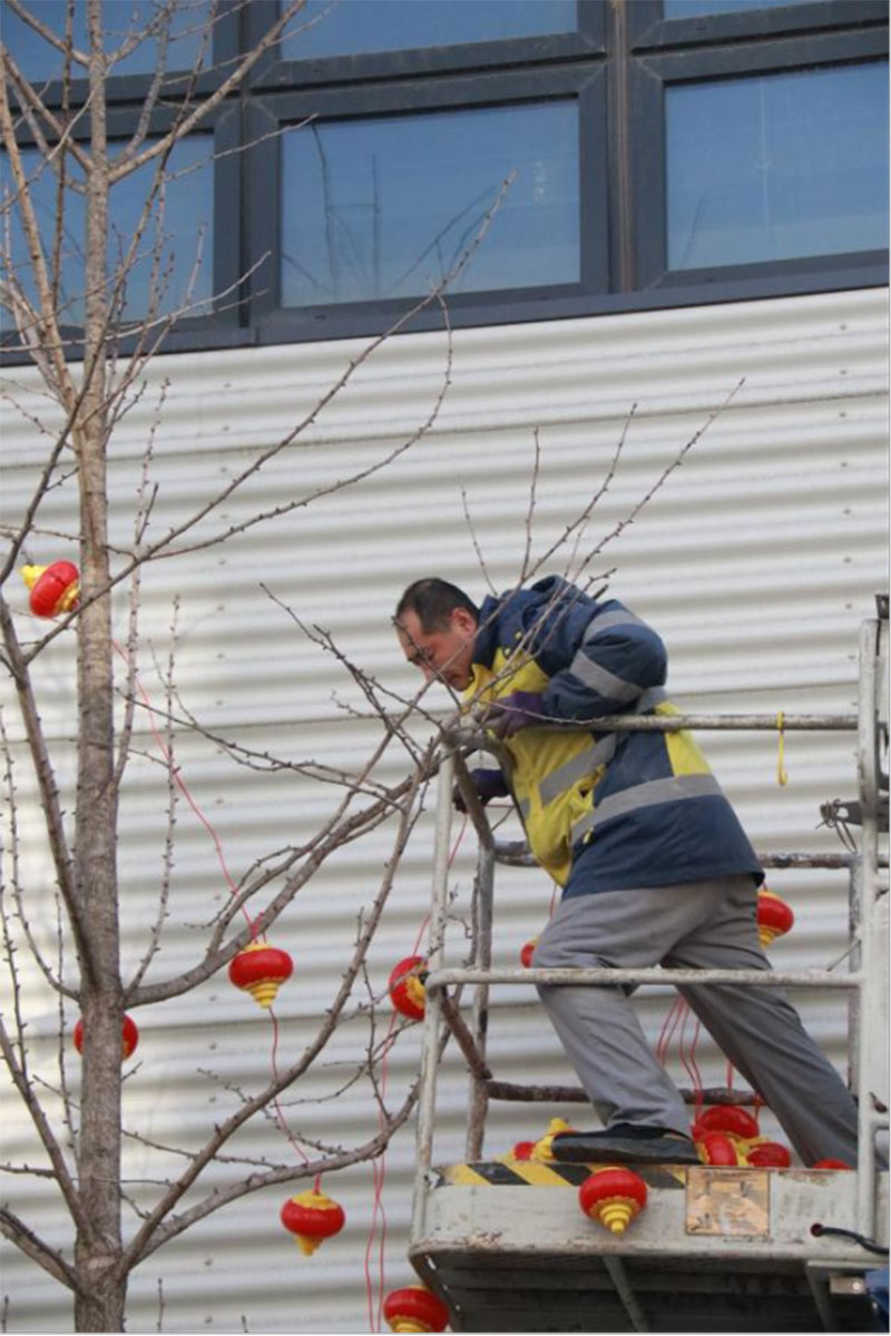 為給園區(qū)營(yíng)造濃厚的節(jié)日氣氛,給入駐企業(yè)帶來(lái)如家般的溫情呵護(hù),沈陽(yáng)航發(fā)展運(yùn)營(yíng)管理有限公司物業(yè)團(tuán)隊(duì),在零下二十度的氣溫下,凍紅了雙手,冰覆了睫毛,但他們依然堅(jiān)守,扶梯的扶梯、攀爬的攀爬,將火紅的燈籠掛在園區(qū)主干道、企業(yè)門前。滿街的火紅,是他們對(duì)園區(qū)的熱愛,也是對(duì)工作的執(zhí)著,更是對(duì)崗位責(zé)任的滿滿執(zhí)念。園區(qū)的燈亮了,客戶們洋溢的笑臉,映襯著角落里一道道靚麗的風(fēng)景線,夜幕降臨下,五彩斑斕的彩色燈光給園區(qū)增添了不少喜慶的色彩,也深深的印在了師傅們熱切的心里。